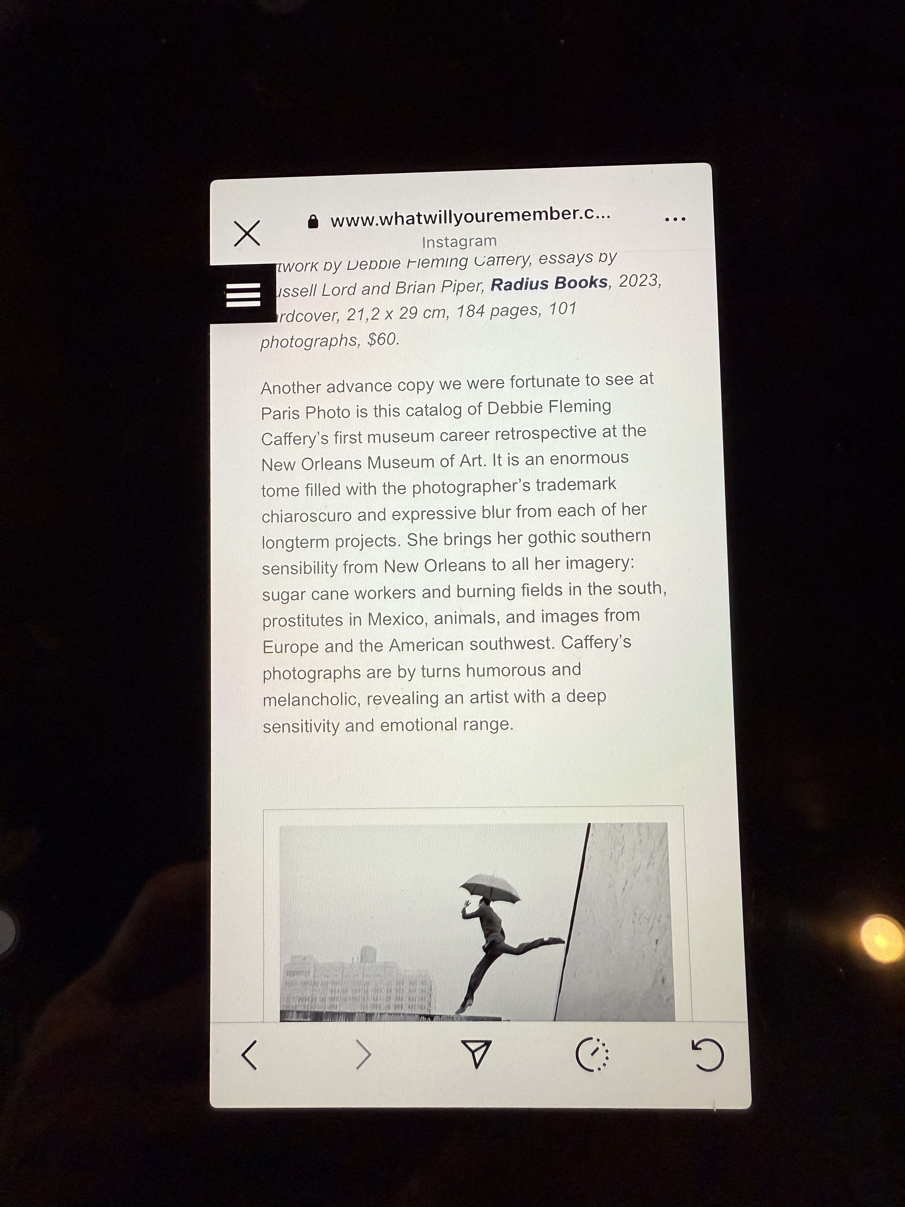 Another advance copy we were fortunate to see at Paris Photo is this catalog of Debbie Fleming Caffery's first museum career retrospective at the New Orleans Museum of Art. It is an enormous tome filled with the photographer's trademark chiaroscuro and expressive blur from each of her longterm projects. She brings her gothic southern sensibility from New Orleans to all her imagery: sugar cane workers and burning fields in the south, prostitutes in Mexico, animals, and images from Europe and the American southwest. Caffery's photographs are by turns humorous and melancholic, revealing an artist with a deep sensitivity and emotional range.
